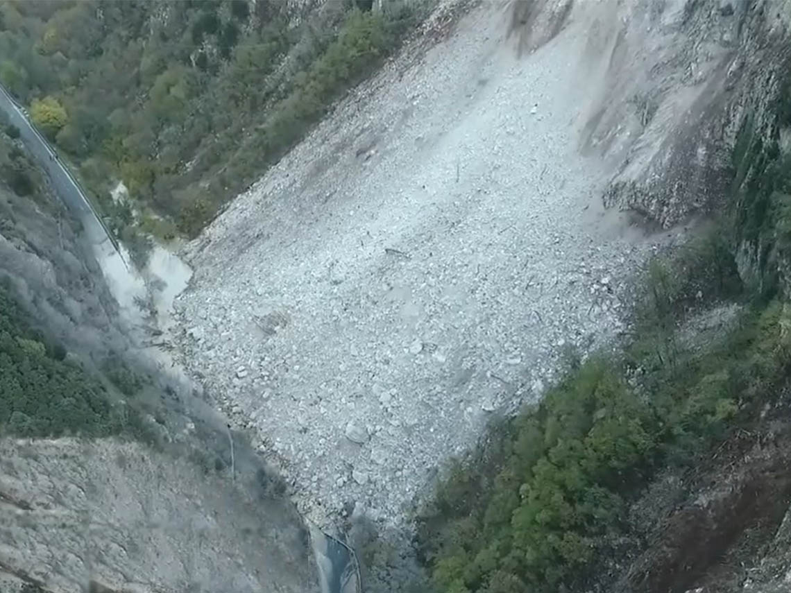La frana in roccia ha coinvolto il versante sinistro dell’idrografia del fiume Nera, creando un accumulo lungo circa 130 metri, largo 150 metri e coprendo un’area di circa 18.000 metri quadrati. Questo accumulo ha ostruito l’intero alveo naturale del fiume Nera, con uno spessore di materiale che ha raggiunto quasi i 15 metri, coprendo completamente la sede stradale.
