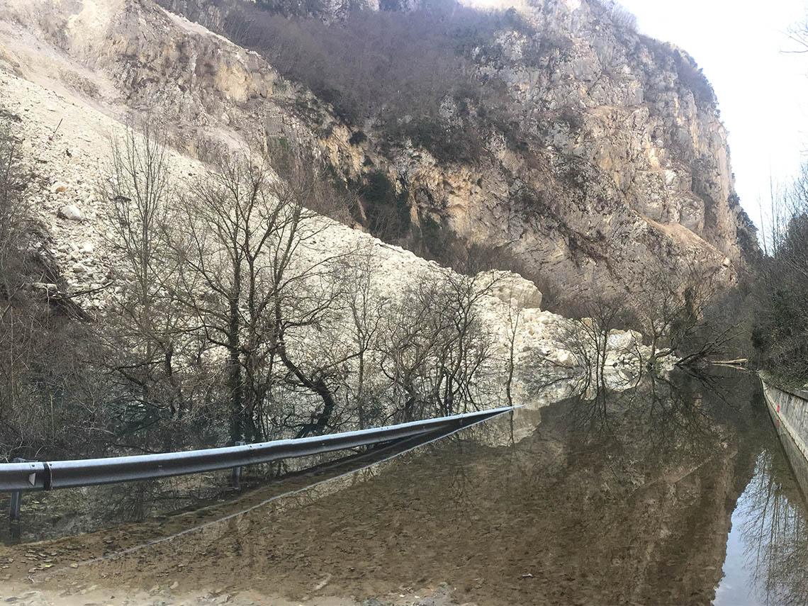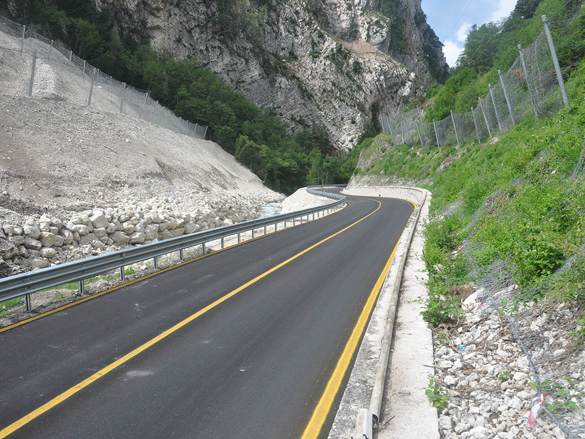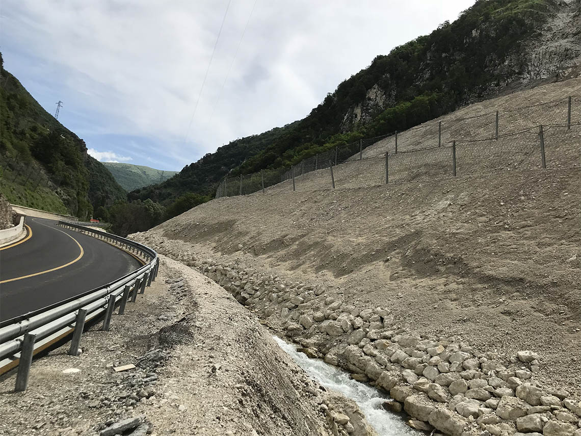 Per raggiungere questo obiettivo, è stato pianificato un processo di rimozione del materiale in sicurezza, seguito dalla ricostruzione dell’alveo del fiume fino al ponte e dal disgaggio del materiale dalla parete. Inoltre, sono state posizionate due file di barriere paramassi con una capacità di 3000 kJ per garantire la futura sicurezza della viabilità.